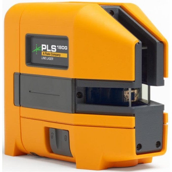 The PLS 180G bare tool is a green cross line laser level for level and perpendicular alignment packaged for individual sale in a printed cardboard box.